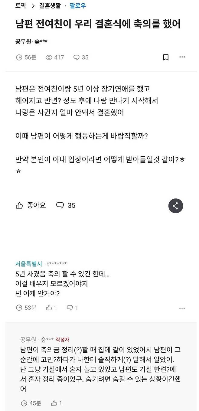 5년 이상 장기연애 했던 전여친이 축의를 했다고 하네요