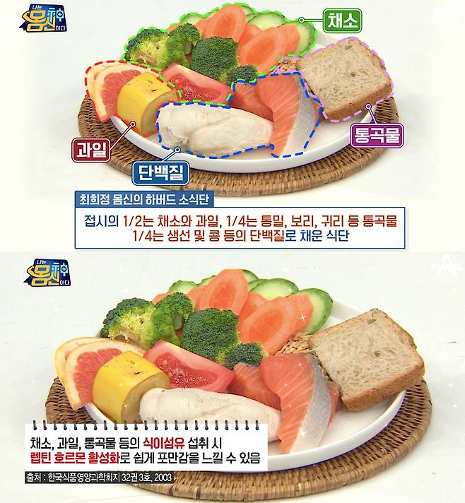 이 식단은 하버드 대학이 제안한 건강 식단 가이드를 기본으로, 25kg 감량에 성공한 ‘몸신’ 최희정 씨의 노하우가 더해진 방식입니다. 구성은 간단합니다. 접시의 절반은 채소와 과일, 1/4은 통곡물, 나머지 1/4은 단백질로 채우는 것. 이렇게만 해도 자연스럽게 식이섬유 섭취가 늘어나고, 포만감이 빨리 찾아와 과식과 폭식을 막을 수 있습니다.