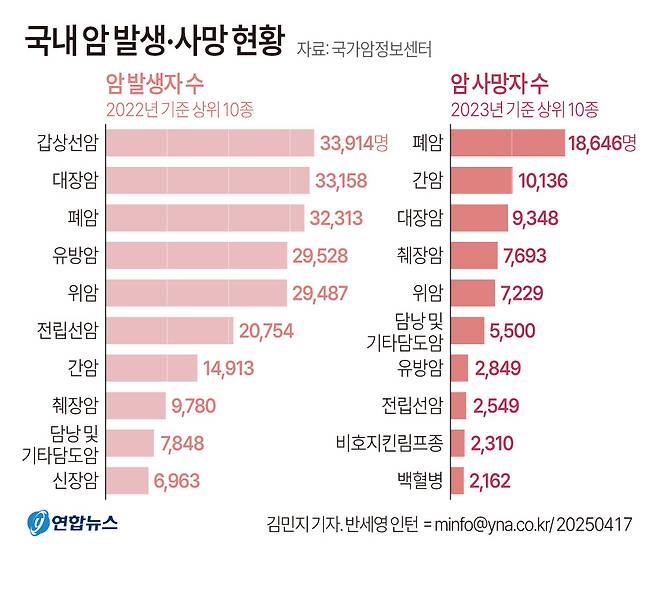 2022년 기준 가장 많이 발생한 암은 갑상선암(3만3천914명·12%)이었고, 대장암(3만3천158명·11.8%), 폐암(3만2천313명·11.5%), 유방암(2만9천528명·10.5%), 위암(2만9천487명·10.5%), 전립선암(2만754명·7.4%), 간암(1만4천913명·5.3%) 순으로 나타났다.