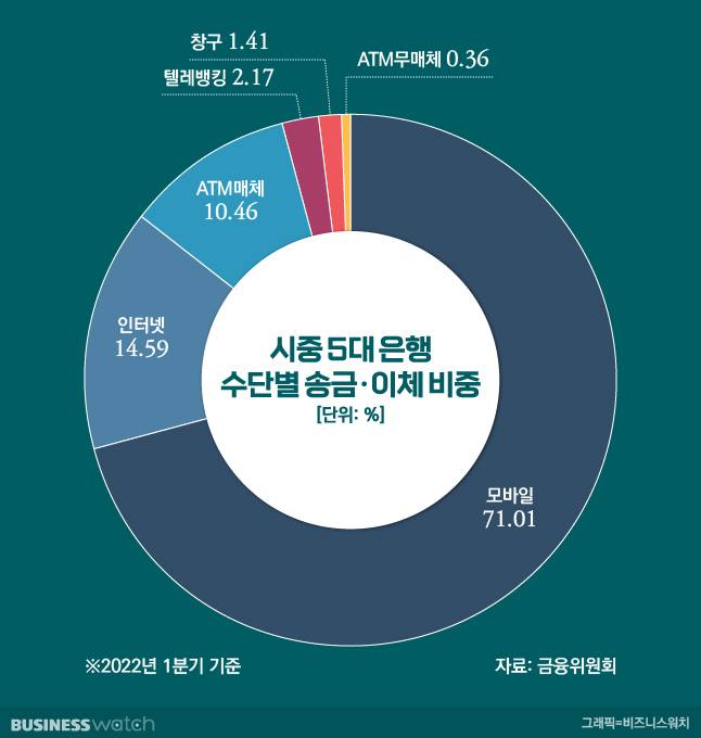 금융위에 따르면 올해 1분기 기준 주요 은행의 수단별 송금·이체 비중은 모바일(71.01%)과 인터넷(14.59%) 순서로 많았다. ATM 무통장입금을 통한 송금 비중은 0.36%에 불과했다. 이중 ATM 무통장 입금 건 중 50만원을 넘는 거래 비중은 36.65% 뿐이었다.