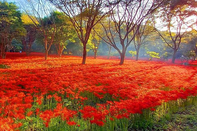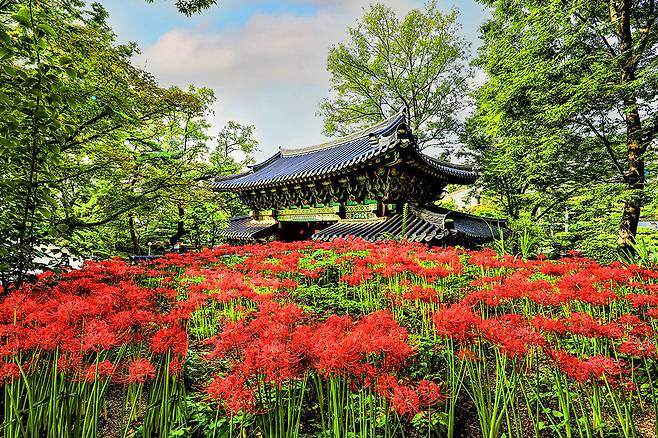 9월 초가을에 방문하면 한편의 넓은 부지에 화려하게 피어난 붉은 꽃무릇 군락을 만나볼 수 있습니다.