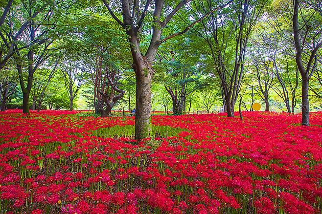 향토적인 정취와 이국적인 풍경을 동시에 만끽할 수 있어 시민들뿐만 아니라 관광객들에게도 편안한 휴식을 선물하고 있습니다. 9월에는 드넓은 녹지에 초록빛 나무와 어우러진 붉은 꽃무릇 군락을 만나볼 수 있습니다.