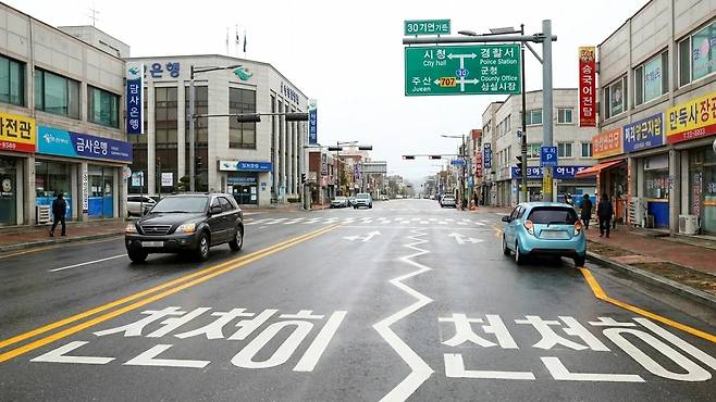 이 표시가 효과를 내는 이유는 시각적 설계에 있다. 물결처럼 이어지는 선은 운전자에게 도로 폭이 실제보다 좁아 보이는 느낌을 주고, 그 결과 심리적으로 속도를 줄이게 만든다.