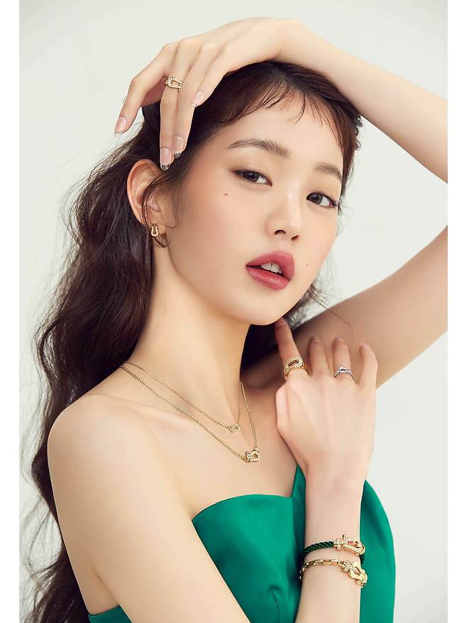위부터 핑크 골드에 다이아몬드를 세팅한 프리티 우먼 롱 이어링, 다이아몬드를 세팅한 핑크 골드 하트 모티브가 사랑스러운 프리티 우먼 네크리스 스몰 모델, 다이아몬드를 하프 파베 세팅한 핑크 골드 펜던트에 카닐리언을 장식한 프리티 우먼 네크리스 미디엄 모델, 오른손에 착용한 다이아몬드를 파베 세팅한 핑크 골드 버클과 핑크 골드 링크 브레이슬릿으로 완성한 포스텐 브레이슬릿, 다이아몬드를 하프 파베 세팅한 핑크 골드 버클과 로즈우드 케이블을 결합한 포스텐 브레이슬릿, 오른손 검지와 중지에 착용한 다이아몬드를 세팅한 렘니스케이트 모티브가 특징인 핑크 골드 소재 샹스 인피니 링, 오른손 약지에 착용한 다이아몬드를 하프 파베 세팅한 화이트 골드 소재 샹스 인피니 링, 왼손 검지와 중지에 착용한 다이아몬드를 파베 세팅한 렘니스케이트 모티브가 특징인 화이트 골드 샹스 인피니 링, 약지에 착용한 다이아몬드를 하프 파베 세팅한 핑크 골드 소재 샹스 인피니 링, 새끼손가락에 착용한 다이아몬드를 하프 파베 세팅한 핑크 골드 소재 샹스 인피니 체인 링 모두 FRED.