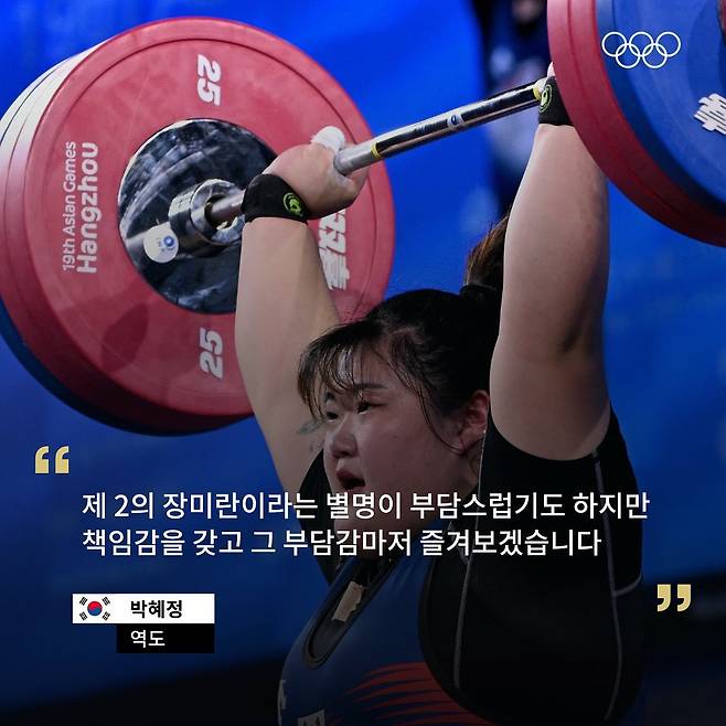 장미란 이후 12년 만에 탄생한 여자 역도 최중량급 올림픽 메달리스트로, 장 차관처럼 첫 올림픽에서 은메달을 목에 걸어 많은 이들의 관심과 응원을 받고 있으며 4년 뒤 LA에선 시상대 꼭대기에 서는 것을 목표로 하고 있다.