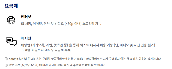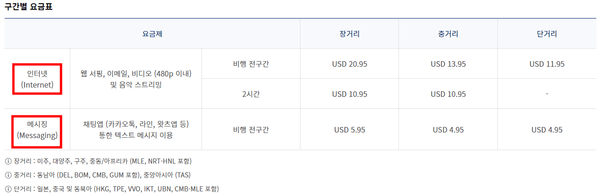 와이파이 서비스 이용요금도 공개했습니다. 여행객이 필요에 따라 이용할 수 있도록 다양한 요금제를 편성했습니다. 요금제는 ‘인터넷’과 ‘메시징’으로 구분하고 운항거리와 서비스 이용시간에 따라 요금을 세분화했습니다.