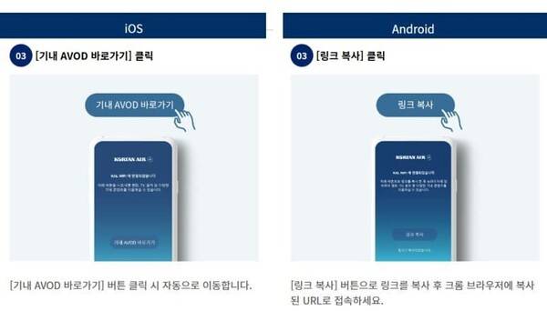 삼성폰과 같은 안드로이드도 아이폰과 처음은 동일합니다. 우선 휴대폰의 비행기 모드를 켜주신 후에 Wi-Fi를 켜고 'KAL Wi-Fi'로 연결해줍니다. 그러면 팝업창이 뜨실텐데 여기서 [링크 복사] 버튼을 눌러 링크를 복사 한 후 크롬 브라우저에 복사 된 URL을 입력 후 접속하시면 콘텐츠를 이용하실 수 있습니다.