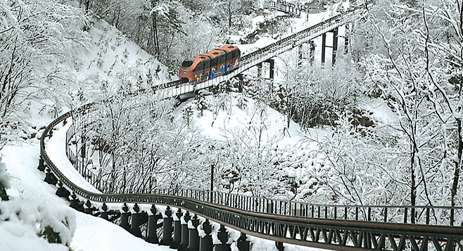 승차장에서 동굴 입구까지는 ‘은하철도 대금호’라 불리는 42인승 모노레일을 타고 610m를 이동합니다.