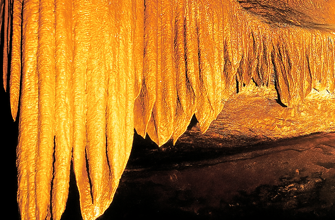 12m 높이의 커튼형 종유석은 마치 거대한 황금 비단이 늘어진 듯 압도적인 아름다움을 자랑합니다.