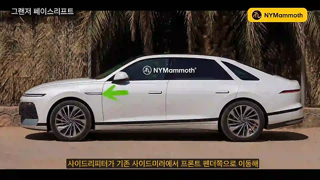 측면부는 페이스리프트 모델의 특성상 큰 변화가 없는 것이 일반적이다. 그러나 이번 그랜저 페이스리프트에서는 사이드 리피터(방향지시등)가 기존 사이드미러에서 프론트 펜더 쪽으로 이동하는 변화가 확인된다.