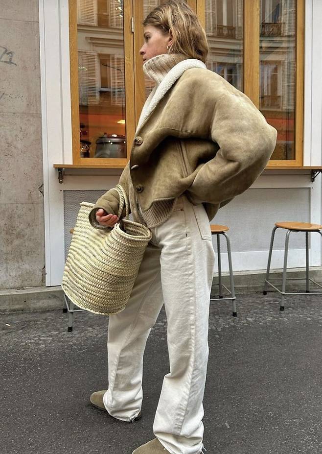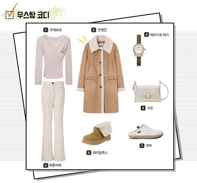 아이보리 계열의 아이템에 베이지 컬러 무스탕으로 포인트를 주어