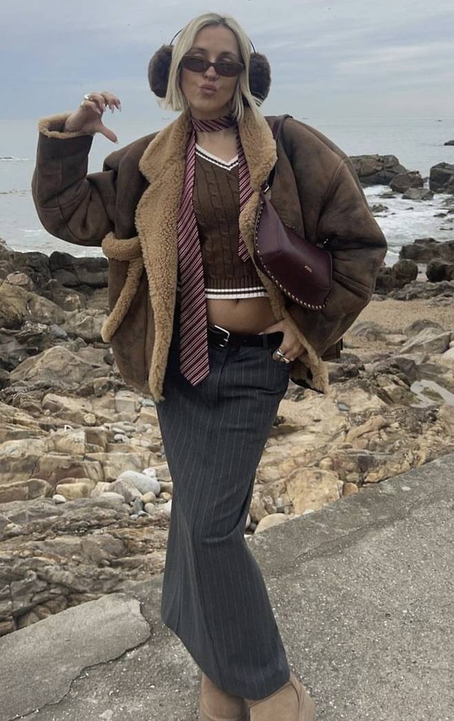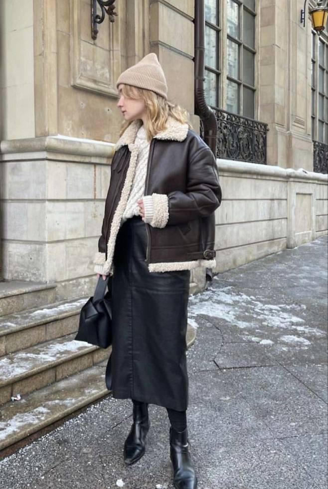 무스탕은 스커트나 원피스와도 찰떡 궁합을 자랑하는데요,
