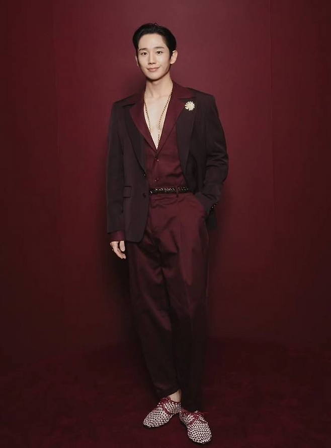 정해인은 지난 1월 이탈리아 밀라노에서 열린 돌체앤가바나 2025 F/W 남성복 컬렉션 패션쇼에 참석해 돌체앤가바나 특유의 관능적인 버건디 슈트룩으로 화제를 모은 바 있다.