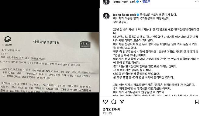 2025년, 박중훈은 아버지가 국가유공자로 선정됐다는 소식을 알렸습니다.