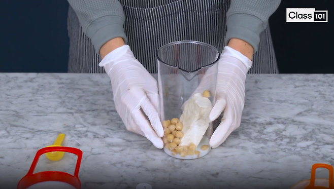 ① 데친 두부와 삶은 병아리콩을 블렌더에 넣어주세요.