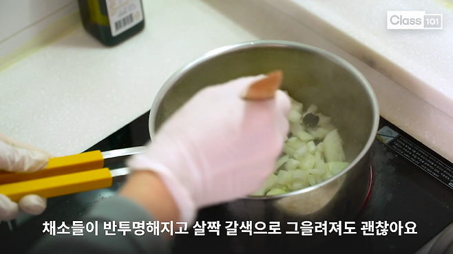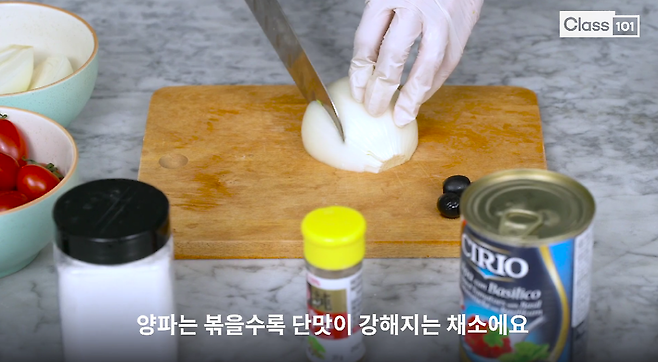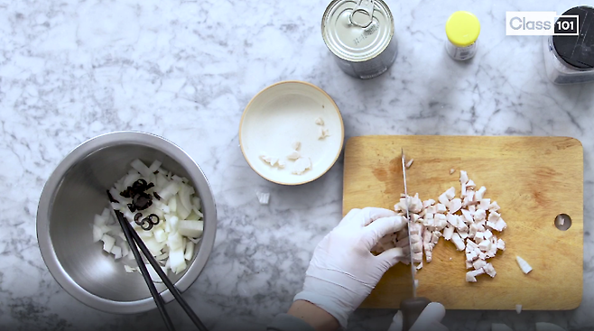 ① 볶을수록 단 맛이 강해지는 채소인 양파! 이 양파를 잘게 썰어줍니다.