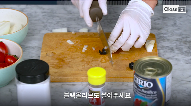 ② 블랙 올리브도 썰어주세요. 토마토소스를 만들 때 올리브오일을 두르고 만드는 방법도 있지만 물로 채소를 볶아서 만들 수도 있습니다.