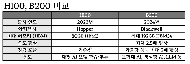 B200은 지난해 출시된 엔비디아의 최신 고성능 GPU로 인공지능(AI) 학습과 실행 속도를 크게 높인 제품이다. 이전 세대인 H100보다 최대 2.5배 빠르며 생성형AI처럼 연산량이 많은 작업에 최적화돼 있다. '블랙웰'이라는 새로운 기술 구조가 적용됐고, 하나의 GPU에 칩 2개와 고속 메모리(HBM3e) 최대 192GB를 포함해 성능을 끌어올렸다.
