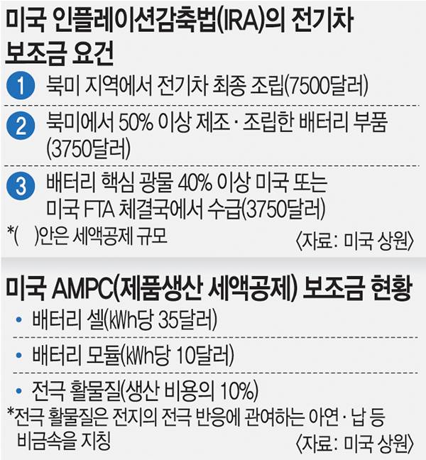 28일 업계에 따르면 미 재무부는 지난해 12월 29일 IRA 법안 백서에서 전기차·배터리 세액공제 혜택의 밑그림을 제시했다. 전기차용 배터리 부품 중 50% 이상을 북미에서 제조하거나 배터리 핵심 광물을 40% 이상 미국 또는 미국과 자유무역협정(FTA)을 체결한 국가에서 조달하면 3750달러씩 최대 7500달러의 세액공제 혜택을 준다. 이 기준은 계속 올라간다. 배터리 부품은 2029년까지 100% 북미 생산으로, 핵심 광물은 2027년까지 80% 이상 조달해야 한다. 사실상 ‘탈중국’ 및 미국 중심의 공급망 재편을 위한 시간표를 제시한 것이다.