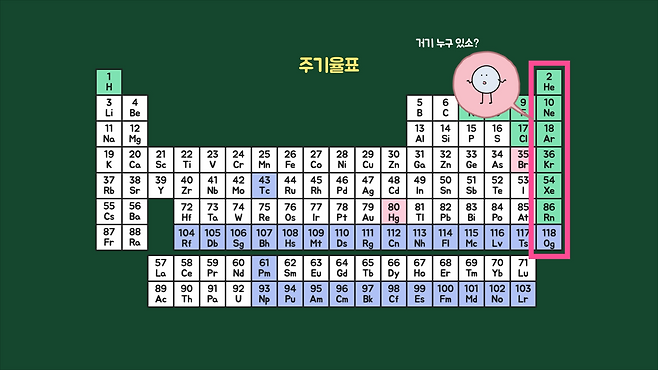 그래도 확실히 예측할 수 있는 것을 보면 일단 화학 반응을 하지 않는 물질이 존재합니다. 주기율표의 맨 오른쪽 세로줄에 있는 헬륨(He)이나 네온(Ne) 등의 불활성 기체들이고, 아무런 반응을 하지 않고 남아있을 겁니다.