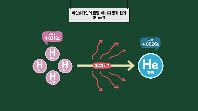 이 조건이 갖춰졌다고 했을 때 핵융합이 일어나게 될 것이고, 이 가상의 혼합물은 조금 더 가벼워지게 되는데, 아인슈타인의 질량-에너지 등가 원리(E=mc2)에 따라 핵융합 과정에서 일부 질량이 에너지로 변환되기 때문입니다.