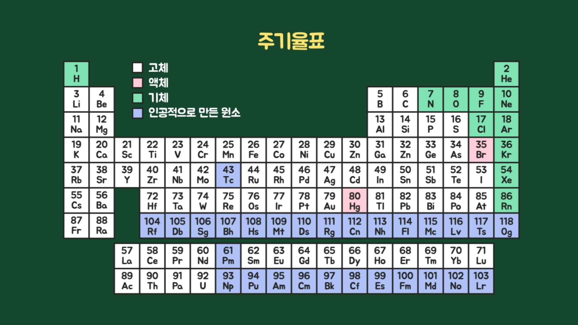 자연에서 발견된 원소와 인공적으로 만든 원소들을 일정한 규칙에 따라 정리한 표를 주기율표(Periodic table)라고 합니다. 현재까지 118개의 원소가 적혀있는데, 이들 원소 중 일부를 결합하여 화학 반응을 일으키면 새로운 화합물을 만들어낼 수 있습니다.