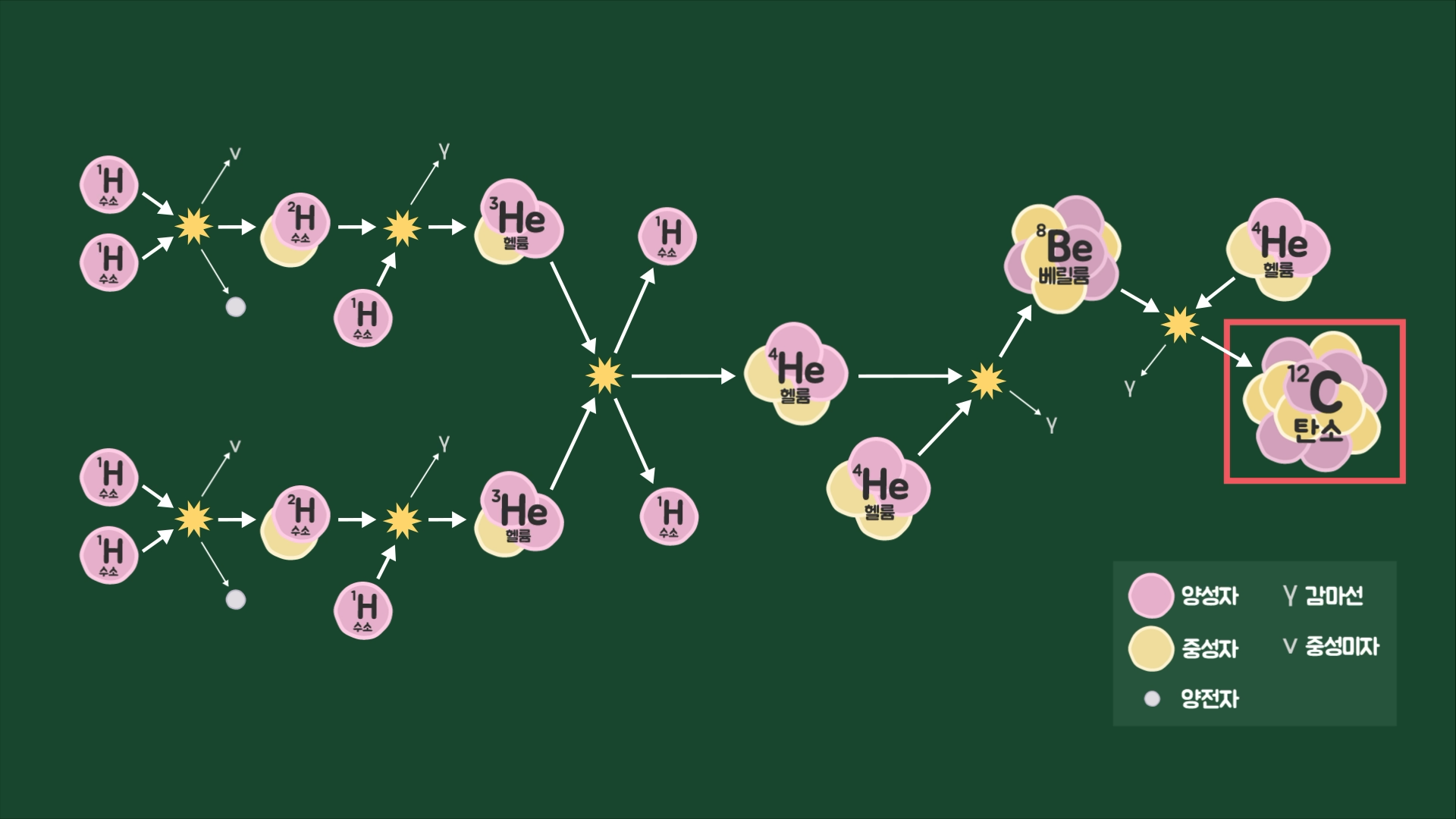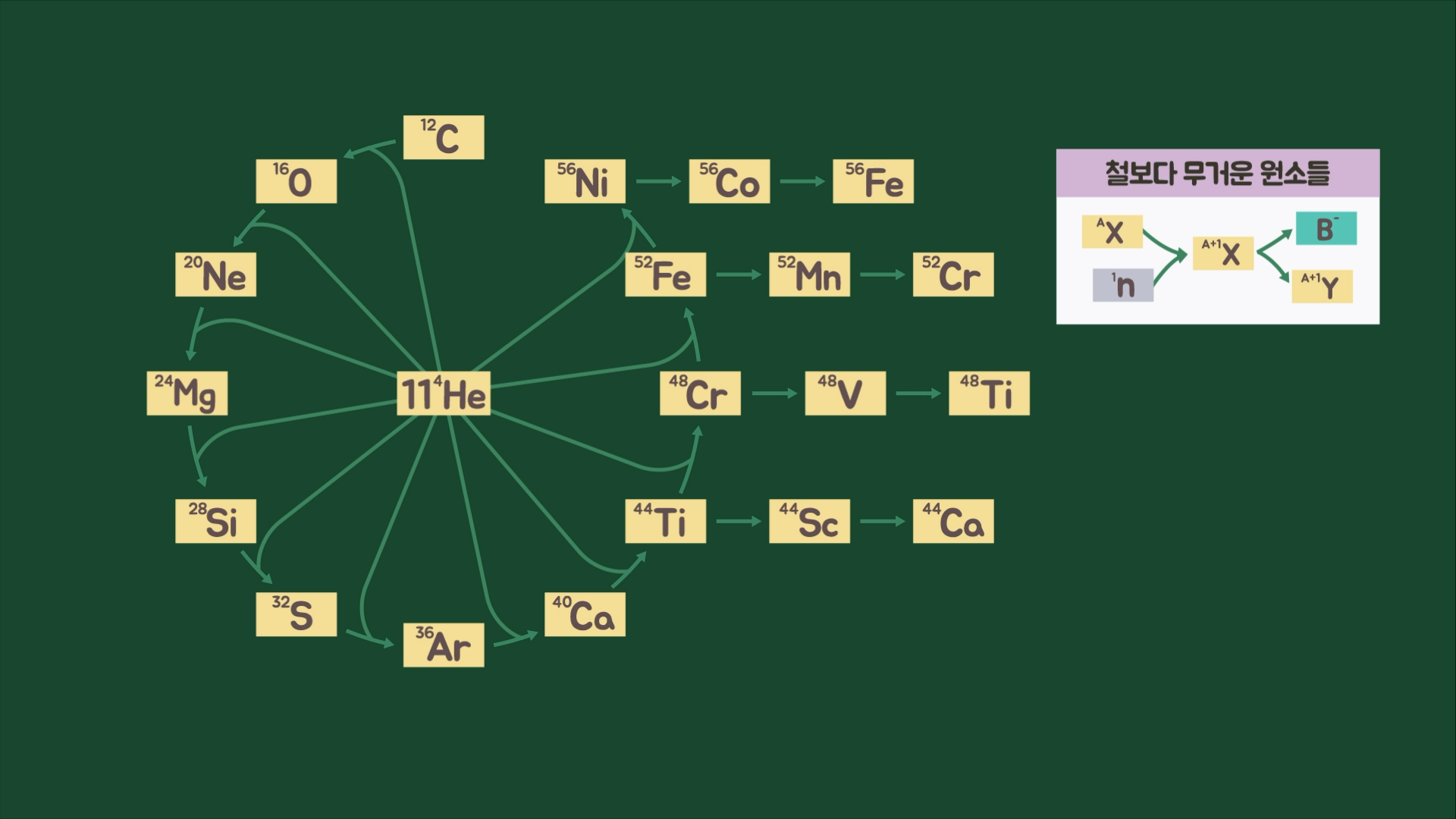 예를 들어 수소 핵융합으로 만들어진 헬륨이 다시 더 큰 물질로 핵융합하여 탄소를 만들고, 탄소가 또 핵융합하여 산소를 만듭니다. 이러한 과정이 반복되면서 철(Fe)까지의 원소를 만들어내며, 초신성 폭발 등의 강력한 에너지로 인해 철보다 무거운 원소들이 추가로 생성됩니다. 그리고 생성된 무거운 원소 중 일부는 시간이 지나면서 방사성 붕괴를 통해 더 가벼운 원소로 변하기도 합니다.