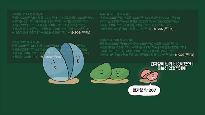 즉, 아주 오랜 시간이 지난 다음 결과물을 확인해 본다면 납과 같은 물질의 양이 늘어나는 식으로 반응이 마무리될 겁니다.