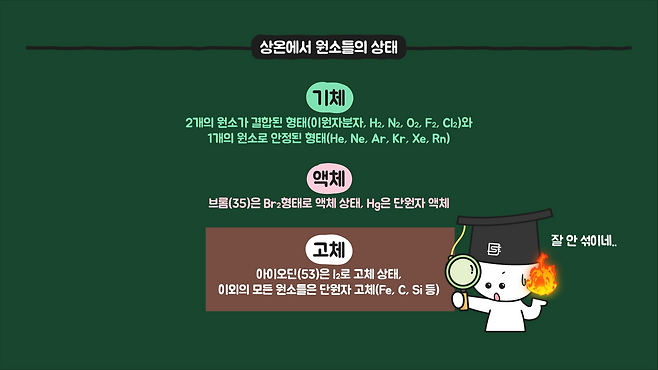 그리고 상온일 때 주기율표에 있는 대부분의 물질은 고체 상태인데, 고체 상태의 물질은 고르게 혼합하기 어려우므로 가열해서 액체나 기체로 만들어줘야 합니다.