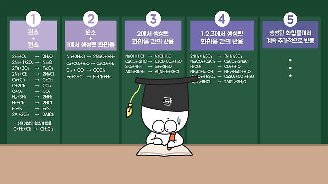 그러다 화학적으로 가장 안정한 상태인 에너지가 가장 낮은 상태에 도달한 원소는 더는 반응을 하지 않을 것이고, 혼합물의 화학 반응은 점차 줄어들며 안정화될 겁니다.