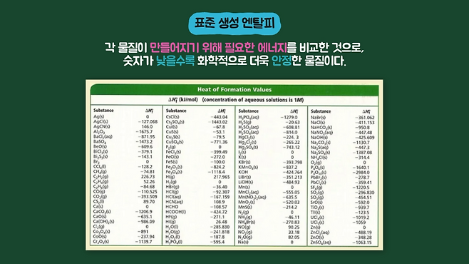 더 자세히 알아보려면 각 원소의 모든 화합물에 대한 표준 생성 엔탈피를 알아야 하는데, 각 화합물이 형성될 때의 에너지를 의미하고, 일반적으로 표준 생성 엔탈피의 값이 낮을수록 화학적으로 더 안정한 물질이 됩니다. 화학 반응이 끝난 후라면 다들 에너지가 가장 낮은 안정한 상태로 존재할 것이고, 용액으로 있다면 용액은 식어가고 있을 겁니다.
