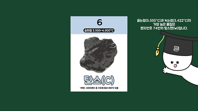 그렇다면 대기압(1기압)에서 몇 도까지 가열해야 모든 원소가 액체나 기체로 될까요? 고체 상태의 물질이 액체 상태를 거치지 않고 직접 기체로 변하는 온도인 승화점이 가장 높은 물질은 원자번호 6번의 탄소(C)로 3,550-4,000℃입니다.