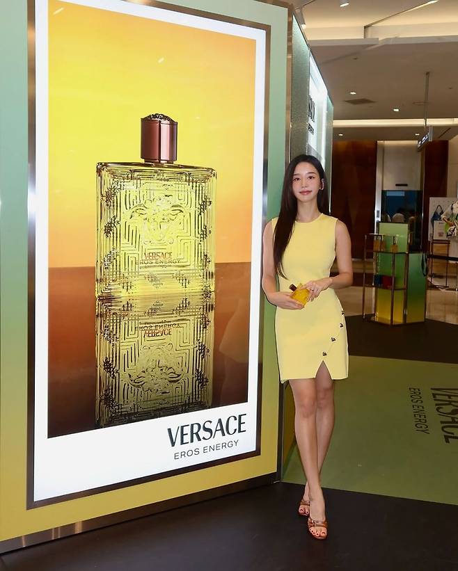 이날 송서미는 화사한 옐로우 컬러의 슬리브리스 미니 원피스를 착용했다. 부드러운 밀착감이 돋보이는 드레스는 심플한 실루엣에 한쪽 허리라인의 버튼 디테일로 포인트를 더했고, 허벅지까지 살짝 드러나는 트임이 여성스러운 매력을 강조했다. 노란빛 드레스는 ‘에로스 에너지’의 시트러스한 향과도 묘하게 어울리며 향수와 패션의 시너지를 완성했다.