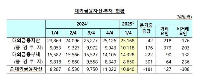 박성곤 한은 국외투자통계팀장은 "미국 증시 조정으로 거주자의 평가액은 줄었지만 해외주식 투자 자체가 늘었고, 금리 인하 기대와 안전자산 선호 경향에 따라 해외 채권 투자도 확대됐다"며 "다만 국내 주가 반등에 따른 외국인의 평가 잔액 증가와 장기 채권 중심 투자 등이 이어지면서 대외 금융부채가 금융자산보다 더 많이 늘었다"고 설명했다.