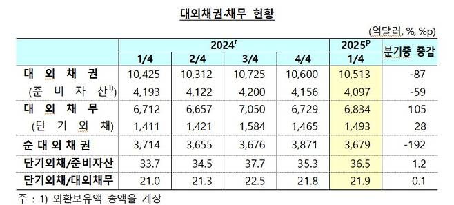우리나라의 1분기 말 기준 대외채권(1조513억달러)은 작년 4분기 말보다 87억달러 줄었다. 국민연금과의 통화스와프 등에 따라 준비자산(외환보유액 총액)이 59억달러 감소한 것도 영향을 미쳤다.
