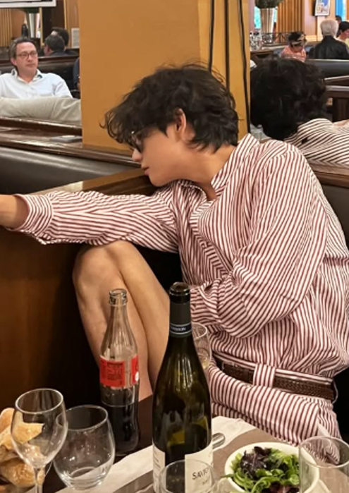 와인 잔을 들고 편안하게 식사를 즐기는 모습과 함께, 다리를 테이블 벤치 위로 올린 자유로운 자세는 뷔 특유의 예술적 감성과 여유로움을 그대로 드러내며 팬들의 시선을 사로잡았다.