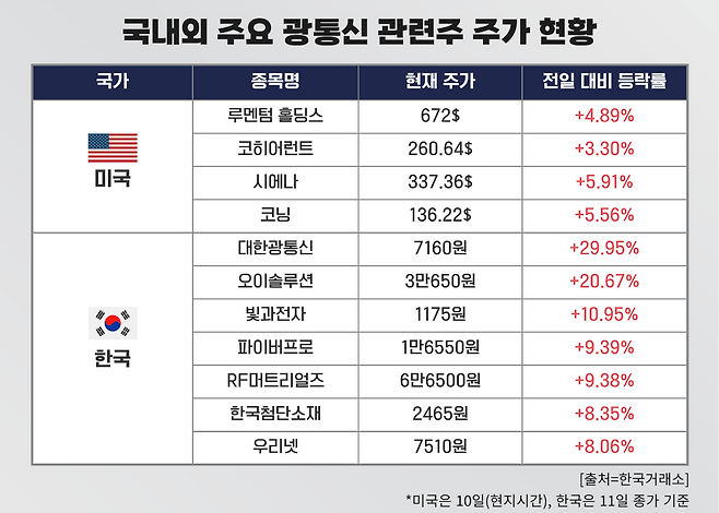 국내 광통신 관련주도 코스피 상승률을 크게 상회하는 등 덩달아 강세를 보였다. 일부 종목은 상한가를 기록하기도 했다. 이날 광통신 관련주의 1일 평균 상승률은 11.74%로 코스피(+1.40%)와 코스닥(-0.07%)의 등락률을 모두 크게 뛰어넘었다. 종목별로 살펴보면 대한광통신이 29.95% 오르며 상한가를 기록했고 오이솔루션도 전일 대비 20.67% 올랐다. 이어 ▲빛과전자(+10.95%) ▲파이버프로(+9.39%) ▲RF머트리얼즈(+9.38%) ▲한국첨단소재(+8.35%) ▲우리넷(+8.06%) 등도 모두 상승 마감했다.