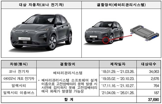 현대차의 경우 코나 전기차, 아이오닉 개조 전기차 등 4개 차종 3만7690대가 배터리관리시스템 소프트웨어 설계 미흡으로 고전압배터리 문제 발생시 사전에 감지하지 못해 화재 발생 가능성이 있어 오는 27일부터 시정조치에 들어간다.