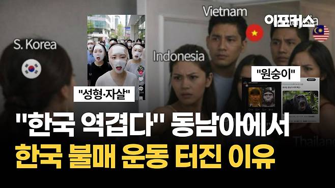 일부 동남아 네티즌들은 한국의 성형 문화와 높은 자살률, 주거 환경을 비하하는 것을 넘어 위안부 피해자와 독립운동가 사진을 조롱하는 등 금도를 넘는 게시물을 쏟아냈습니다.