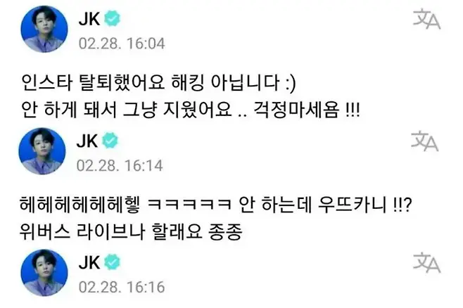 정국은 “인스타(그램) 탈퇴했어요. 해킹 아닙니다. 안 하게 돼서 그냥 지웠어요. 걱정마세요”라고 밝혔다.