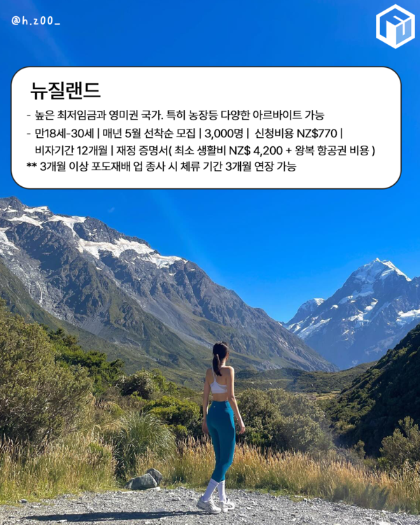 ✔️ 만18세-30세✔️ 매년 5월 경 3,000명 선착순 모집✔️ 비자기간( 입국일 기준 약 12개월) | 어학연수 6개월까지 가능✔️ 신청비용 NZ$770✔️ 필수 서류 : 재정 증명서 (최소 생활비 NZ$ 4,200 + 왕복 항공권 비용 ), 신체검사결과서