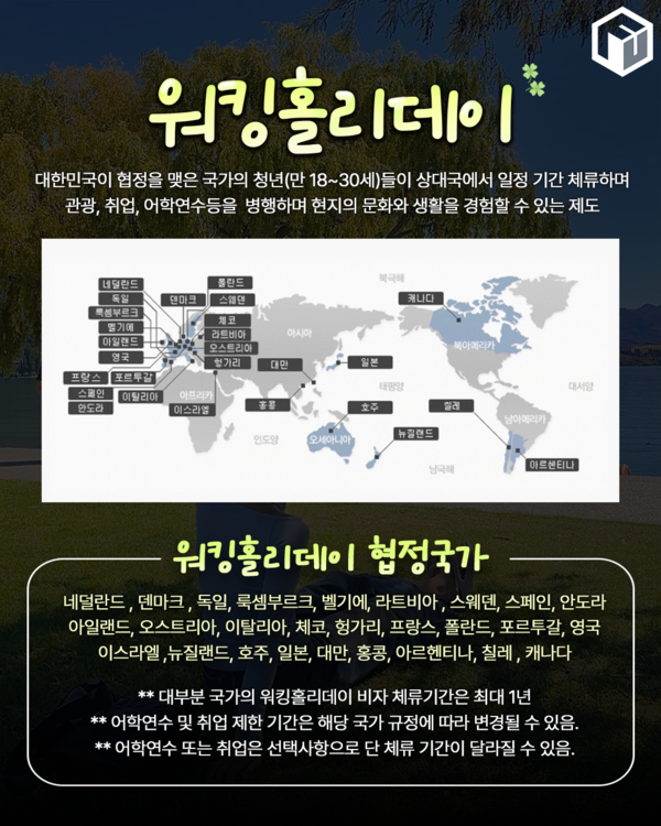 ✔️ 만18세-34세✔️ 연 2회 상반기, 하반기 800명 모집✔️ 비자기간(입국일 기준 약 12개월) | 어학연수 6개월가능✔️ 비자 신청 비용 €60✔️ 재정 증명서 ( €1,500 이상)