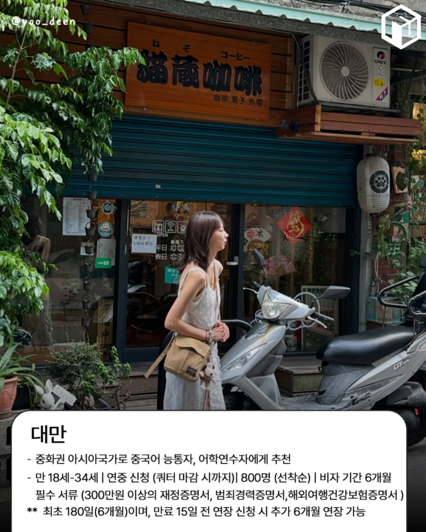 중화권 언어와 문화를 경험하고 싶은 이들에게는 대만이 좋은 선택이 될 수 있습니다. 타 국가에 비해 비교적 짧은 비자 기간(6개월)이지만, 연장을 통해 최대 12개월까지 체류가 가능합니다. 중국어 공부, 아르바이트, 현지 문화 체험을 함께 하고 싶은 분께 추천합니다.