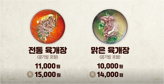 🔹맑은육개장 (10,000원): 깔끔하고 개운한 국물, 부담 없는 맛
