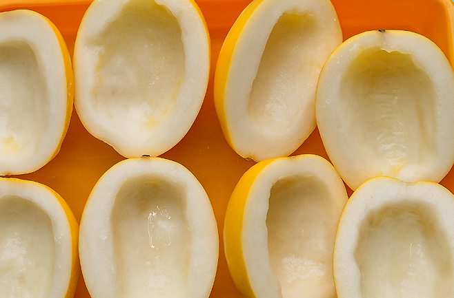참외는 깨끗이 씻어 양쪽 끝을 자르고, 반으로 갈라 씨를 긁어냅니다.껍질은 벗기지 말고 그대로 사용하면 식감이 더 살아납니다.