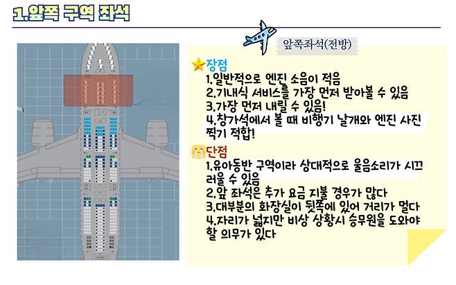 다만 앞쪽 좌석의 대부분은 '프리미엄 좌석'으로 분류돼 추가 요금이 부과될 수 있습니다. 또한, 출구 앞 좌석(비상구석)의 경우 기내 수하물을 발밑에 둘 수 없는 경우가 있습니다. 화장실이 뒤쪽에 있는 경우에도 오가기가 불편할 수 있으며 영유아를 동반한 승객이 탑승해 소음이 많이 발생한다는 것을 참고하세요.