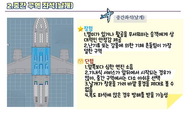 비행기 중간 좌석의 주요 특징은 난기류나 강풍에 의한 기체 흔들림이 가장 적다는 것인데요. 멀미가 있거나 비행기를 무서워하는 승객에게 상대적으로 안정감을 주어, 첫 비행을 시작하는 분들에게 알맞는 좌석입니다.