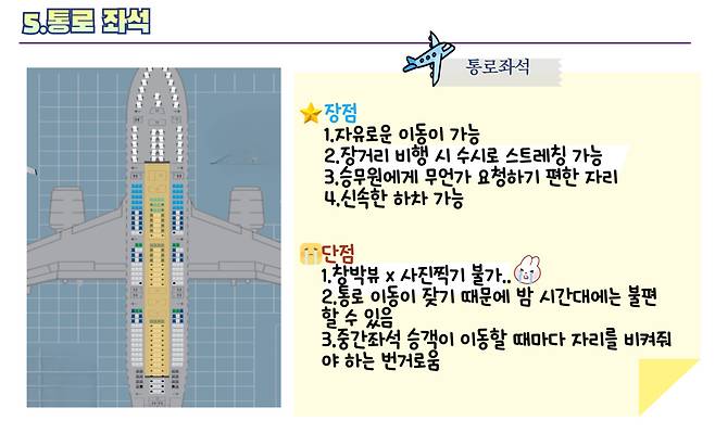 다만 중간 좌석 복도구역을 선택한다면 비행중 기지개나 스트레칭을 할 수 있다는 것이 크게 다가오는 장점이니 기억해 두세요.