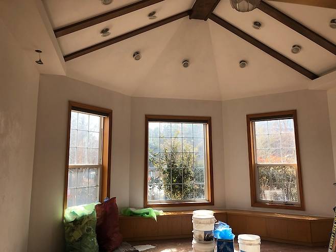 천장이 높아서 답답하지 않고, 모든 창문에는 자동 블라인드가 있어서 버튼 하나로 올리고 내릴 수 있어서 정말 편해요. 이 또한 전에 사시던 분께서 모두 설치하셨던건데 아주 잘 쓰고 있어요.