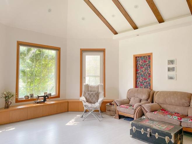 거실은 제가 정말 좋아하는 공간이에요. 계절이 오롯이 느껴지는 큰 창과 넓은 천장 덕분에 소파에 앉아만 있어도 힐링되는 기분이거든요.